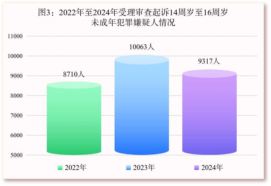 (3)办理低龄未成年人犯罪人数有所下降。2024年,全国检察机关受理审查起诉14周岁至16周岁的未成年犯罪嫌疑人9317人,同比下降7.4%。